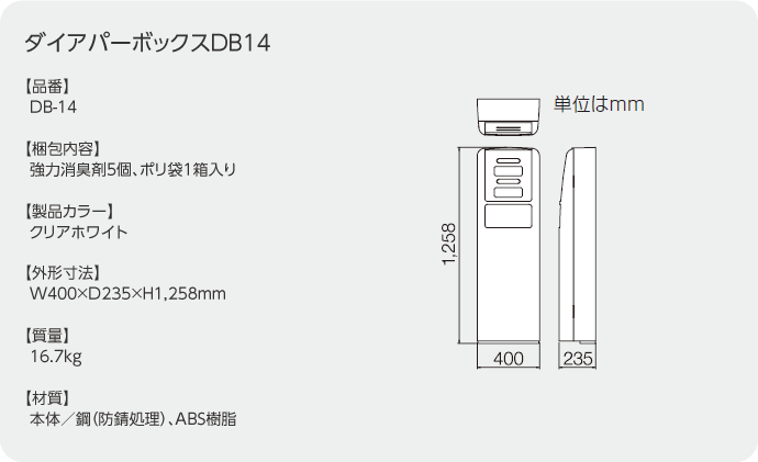 仕様製品名 ダイアパーボックスDB14 品番 DB-14製品カラークリアホワイト(CW)外形寸法(mm)W400×D235×H1,258 質量(kg) 16.7 材質本体:鋼(防錆処理)、スチロール樹脂価格¥128,000(税込¥134,400)(ポリ袋1箱、消臭材5個入り・取付工事費別) 施工方法床面と壁面にアンカーボルト等で固定します。